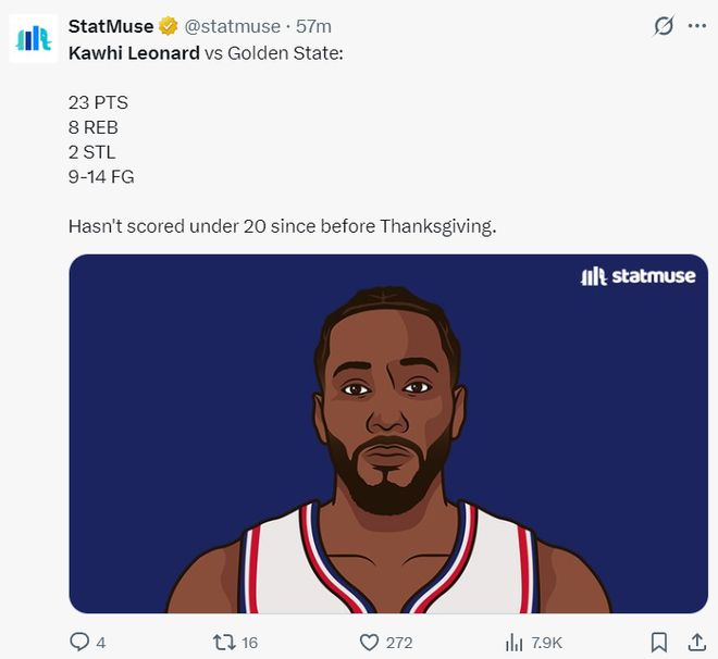 伦纳德自感恩节后就没有下过20+,本赛季的伦纳德场均32.6分钟,拿到27.8分6.3篮板3.7助攻2抢断0.5盖帽,命中率49.6%,三分命中率37.8%。