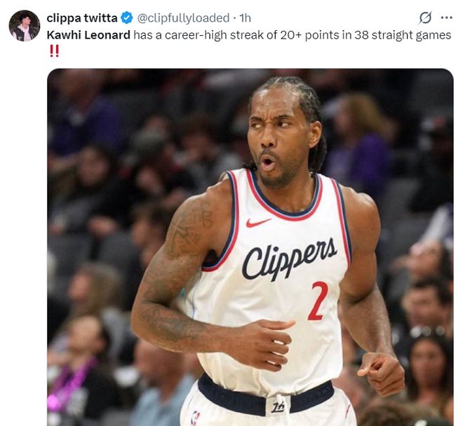 此役伦纳德还完成连续38场比赛20+创造职业生涯新高,这也是快船队史第二长,最长的是74-75赛季的鲍勃-麦卡杜44场,本赛季伦纳德就有希望打破这项纪录。